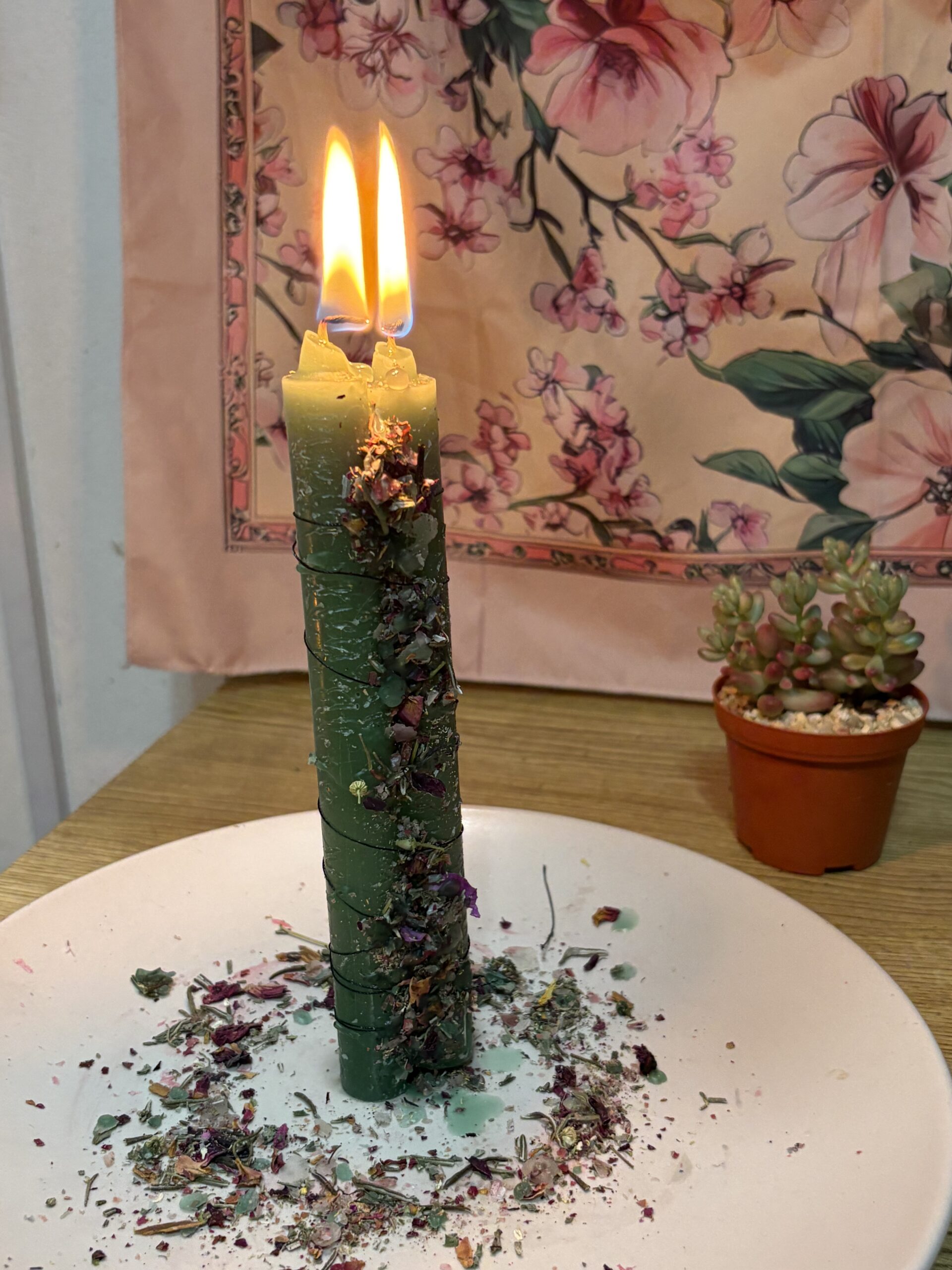 Se hace con dos velas verdes, albahaca, romero, canela, manzanilla, loción abre caminos.